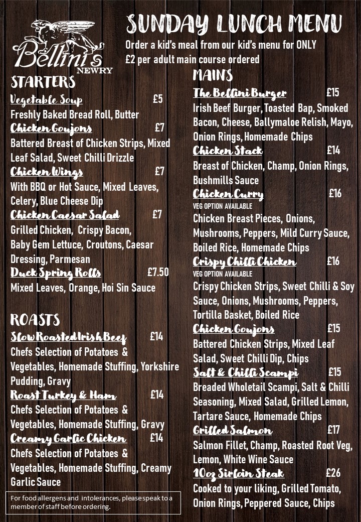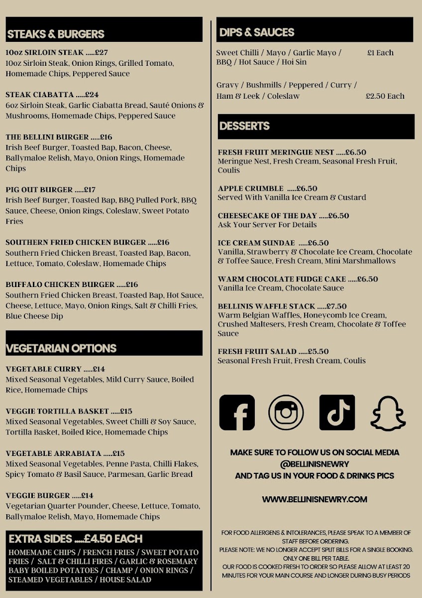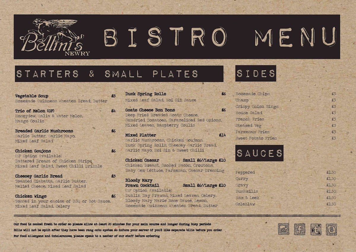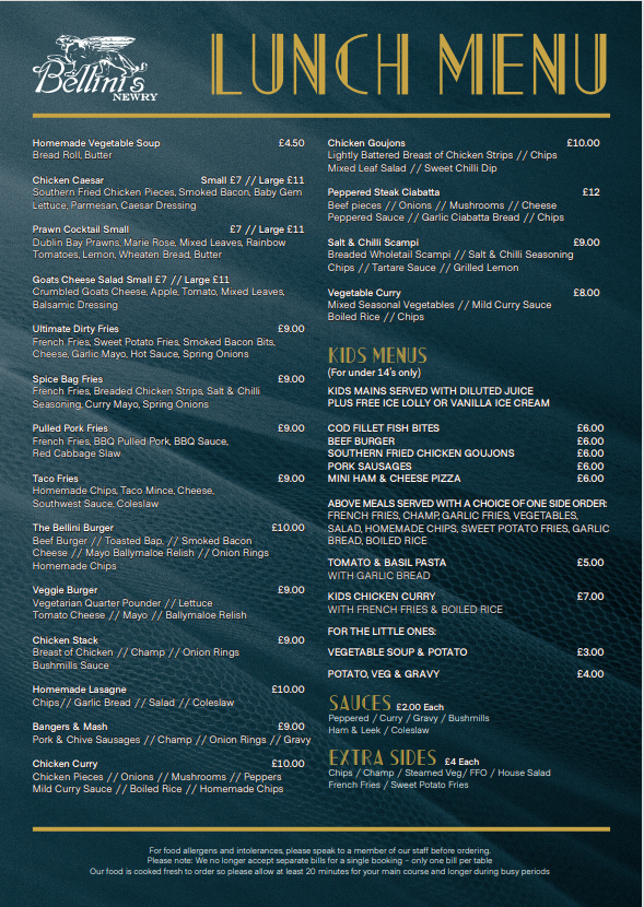 Bellini’s Newry Menu at 25 Merchants Quay, Newry BT35 6AH, United Kingdom, offers an inviting dining experience that blends contemporary Irish cuisine with an elegant yet relaxed atmosphere. From the moment you step inside, Bellini’s feels vibrant and sophisticated-perfect for both casual lunches and special evening occasions. The restaurant’s design exudes warmth, featuring stylish décor and a welcoming staff who set the tone for an enjoyable visit.
